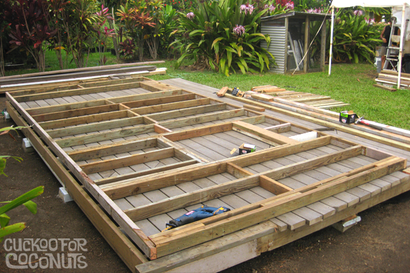 The shed is pretty much being made from the old shed we tore down so we could build the office. With the exception of six 16 foot long 2x6's that we had to buy for additional roof joists. So all but those, nails and some door hardware and this is pretty much a free structure for us. Oh did I mention John and I are the only two building it? With the help of our amazing team from Mauka Builders last summer on the office construction (we still owe you images of that finished project... soon we promise), we learned a lot more than we already had already stored in our construction data base... that and the aide of some internet videos.